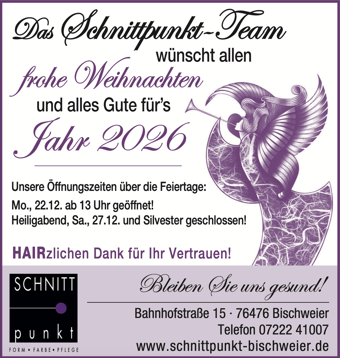 bei SCHNITTpunkt – Ihrem Trendfriseur für die ganze Familie und jeden Haar-Typ. Ganz nach unserem Slogan „Hair 4 U“ stehen Sie und Ihr Haar bei uns täglich im Mittelpunkt. Sehr gerne stehen wir für eine persönliche Beratung zur Verfügung.